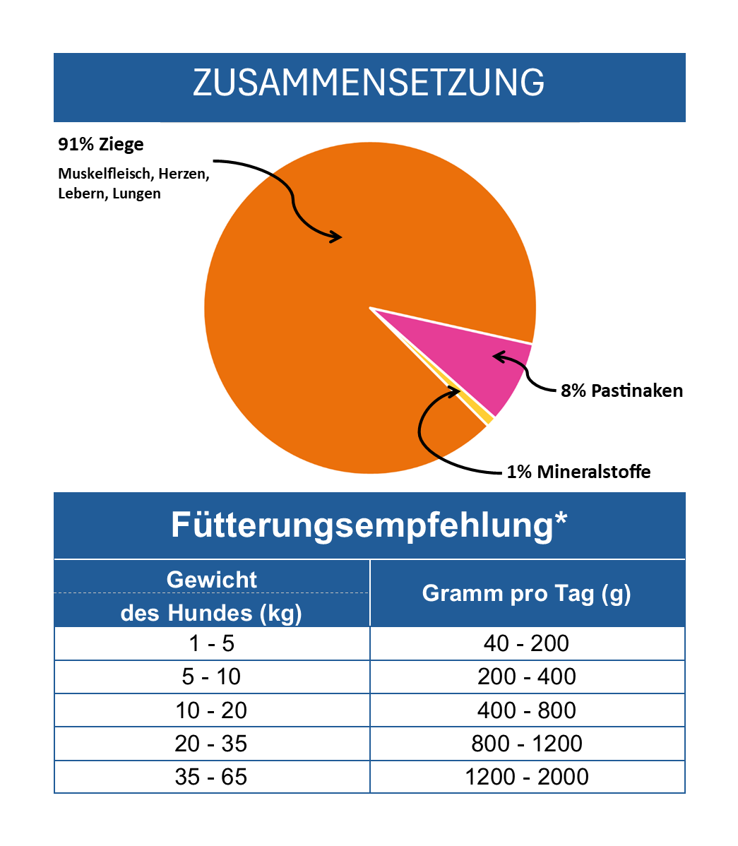 Fleisch und Innereien von der Ziege (91%), bestehend aus Muskelfleisch, Herzen, Lebern und Lungen. Gemüse (8% Pastinaken) für eine natürliche und bekömmliche Ergänzung. Mineralstoffe (1%) für eine ausgewogene Ernährung.