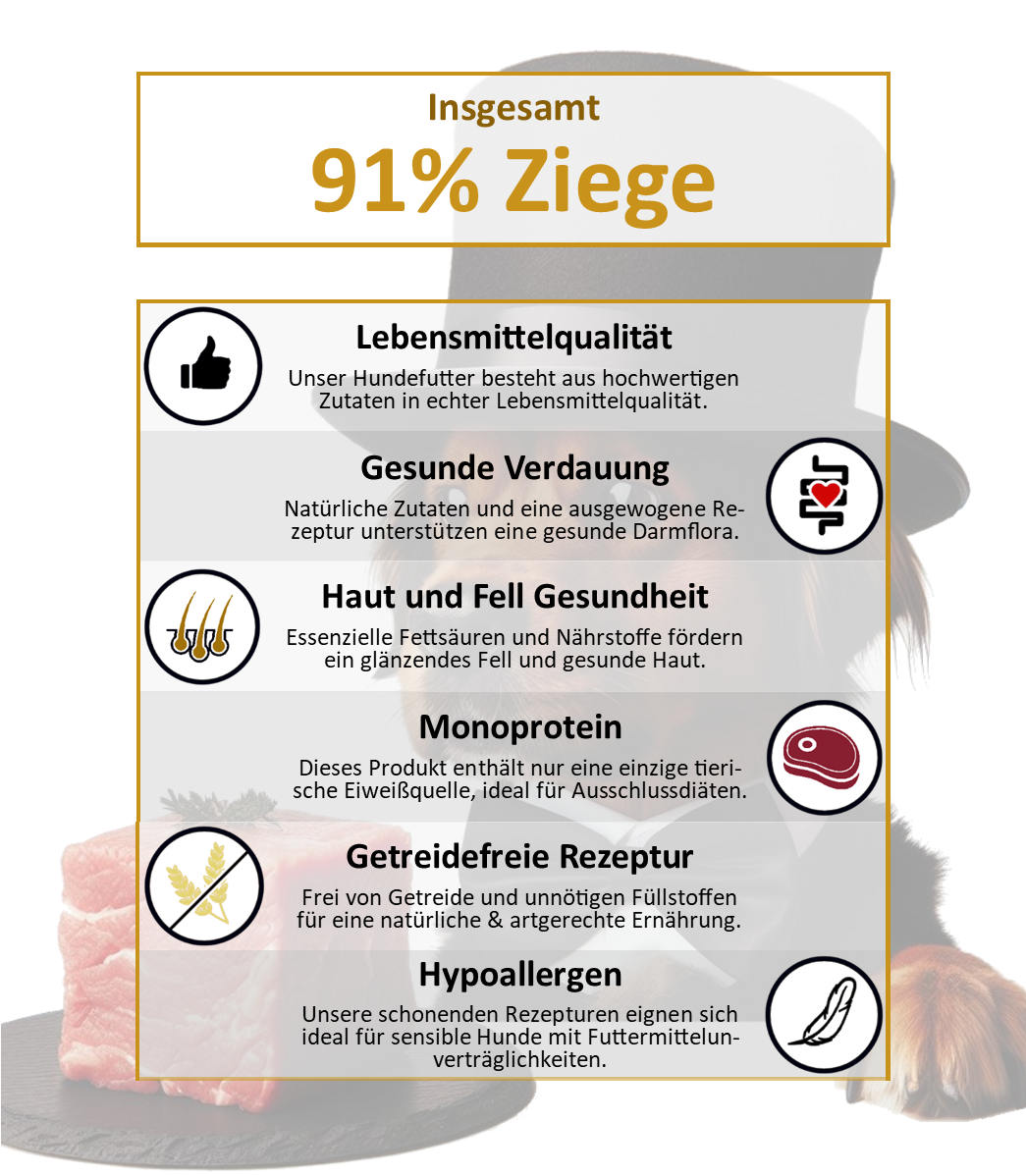 - Single Protein: Enthält nur eine tierische Proteinquelle (Ziege).